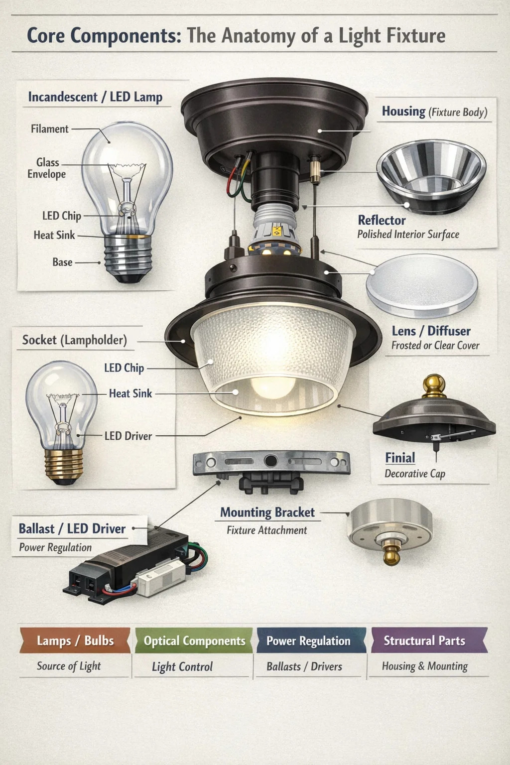 Egy világítótestet, amelyet gyakran lámpatestnek neveznek, több különálló elemből áll világító alkatrészek amelyek egységesen működnek a megvilágítás érdekében. A legalapvetőbb részek közé tartozik a lámpa (izzó) , a aljzat , a ház (szerelvénytest) , és a lencse vagy diffúzor . Míg az izzó hozza létre a fényt, addig a többi alkatrész felelős az izzó helyben tartásáért, védelméért és a fénysugarat a kívánt területre irányítani.